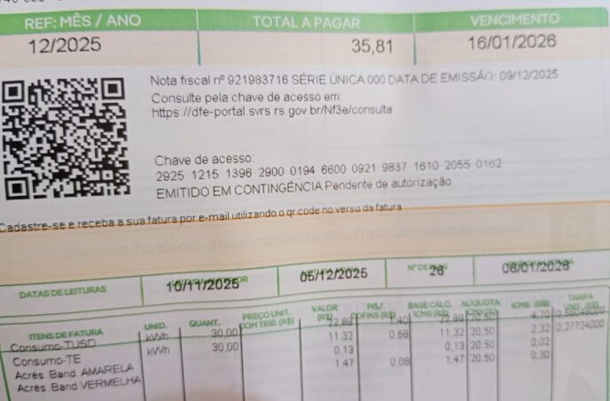 De acordo com clientes da concessionária, há casos com até mais de um mês como é caixa dessa conta da foto que ainda vai vencer em 16 de janeiro de 2026, ou seja, mais de um mês.