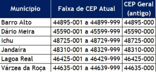 Os Correios finalizaram a implementação da codificação postal específica para as cidades baianas de Barro Alto, Dário Meira, Ichu, Jandaíra, Lagoa Real e Várzea da Roça.