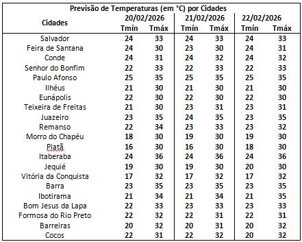 No Estado, a temperatura mínima deve ser de 16 grau Piatã e a máxima deve atingir 36 graus em Itaberaba e 35 graus em Barra, Juazeiro e Paulo Afonso.