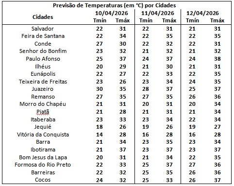 No Estado, a temperatura mínima deve ser de 14 graus em Vitória da Conquista e a máxima deve atingir 36 graus em Itaberaba e 37 graus em Barra, Eunápolis e Ibotirama e 37 graus Formosa do Rio, Ibotirama e Paulo Afonso.