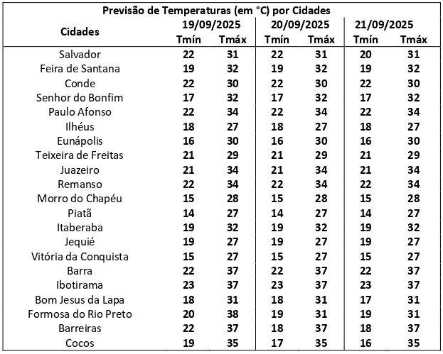 No Estado, a temperatura mínima deve ser de 14 graus em Piatã e e a máxima deve atingir 38 graus em Formosa do Rio Preto e 37 graus em Barra e Ibotirama.
