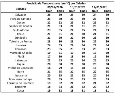 No Estado, a temperatura mínima deve ser de 17 graus em Piatã e 18 em Barreiras e Vitória da Conquista e a máxima deve atingir 37 graus em Barra, Juazeiro, Paulo Afonso e Remanso.