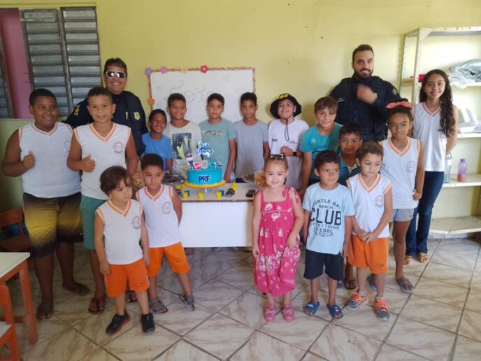 Ao chegarem na Escola Mentes Brilhantes, o garoto ficou entusiasmado ao ver a viatura da PRF na porta da escola no momento do aniversário.