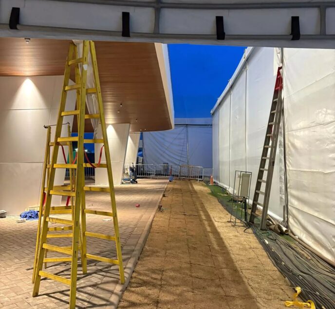 O caminho da entrada do hangar, que dá acesso à Cúpula dos Líderes, até a outra ponta da Zona Azul é extenso — o espaço, cujas obras tiveram início em 3 de julho, foi projetado com uma grande área.