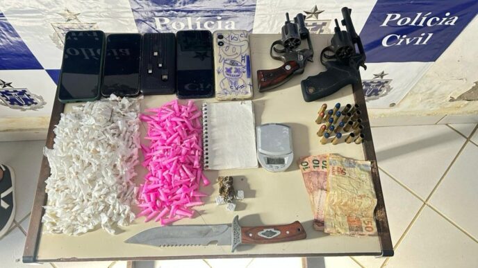 Pouco mais de 500 porções de entorpecentes, armas de fogo e munições foram apreendidas com integrantes de uma facção, durante operação das Polícias Civil e Militar no Sul da Bahia. O flagrante aconteceu na quinta-feira, 14/8.